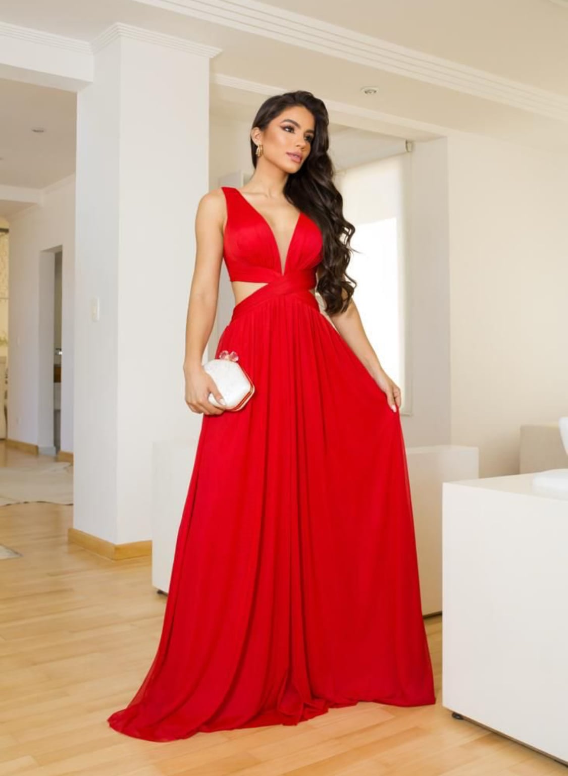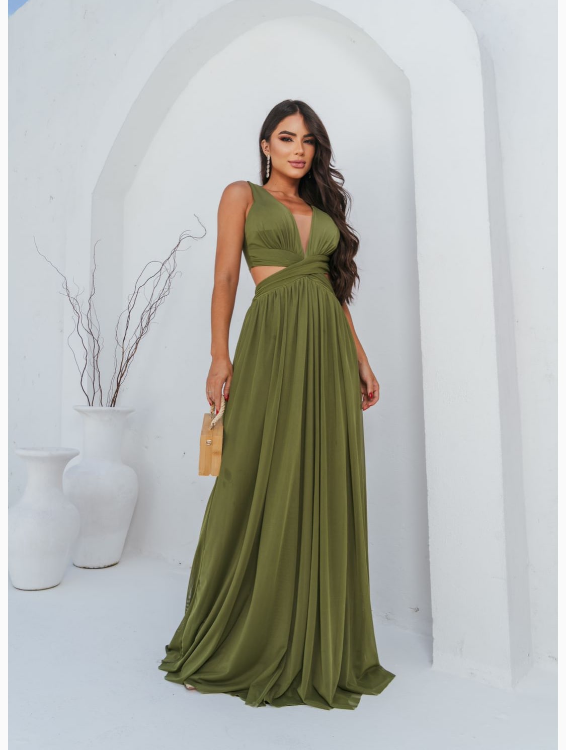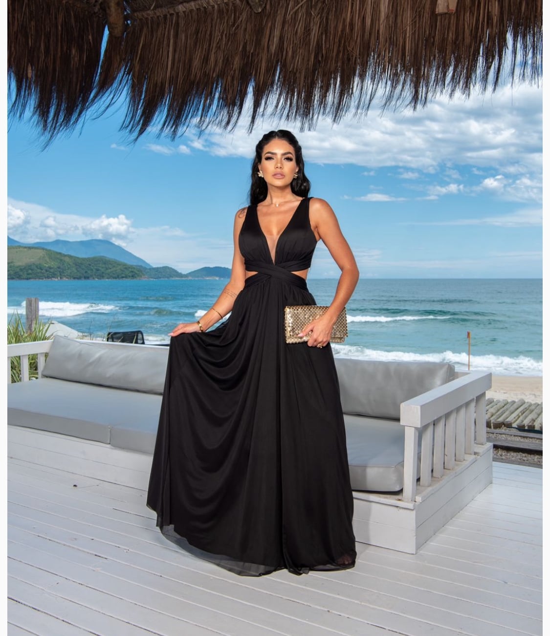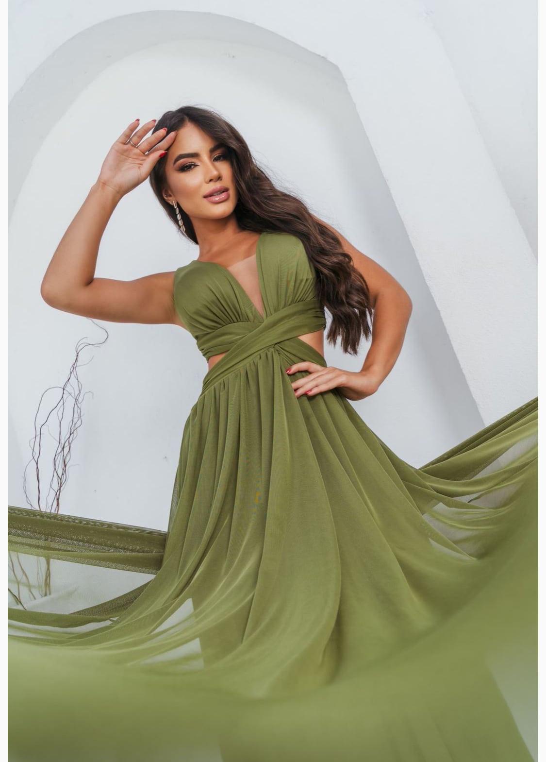 O vestido Sabrina com sua elegância e sofisticação se destaca por seus detalhes; decote em V com transparência em tule, aberturas laterais, amarração nas costas e além do tecido em micro tule que proporciona um caimento perfeito no corpo feminino.