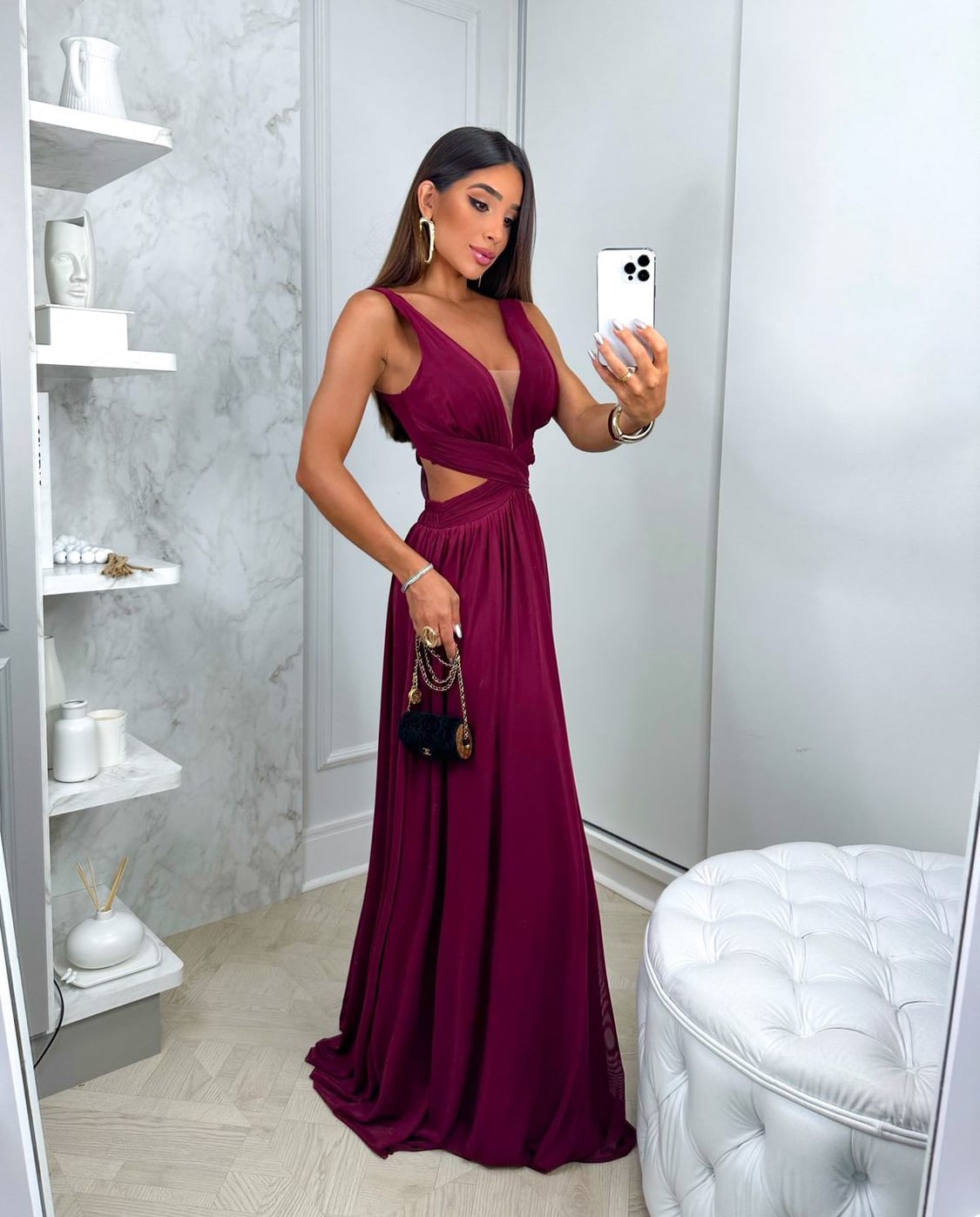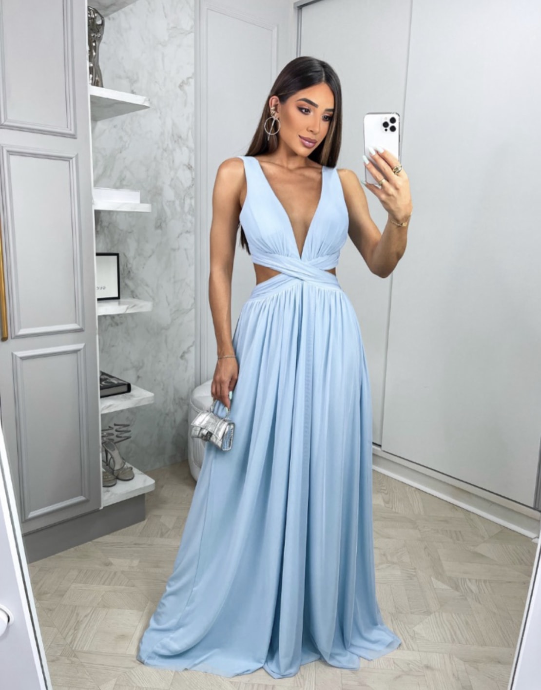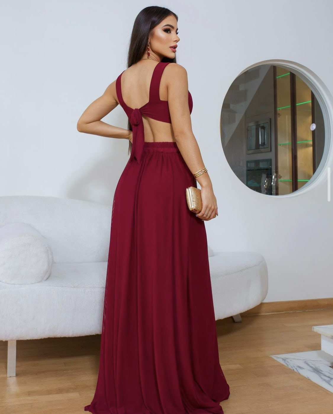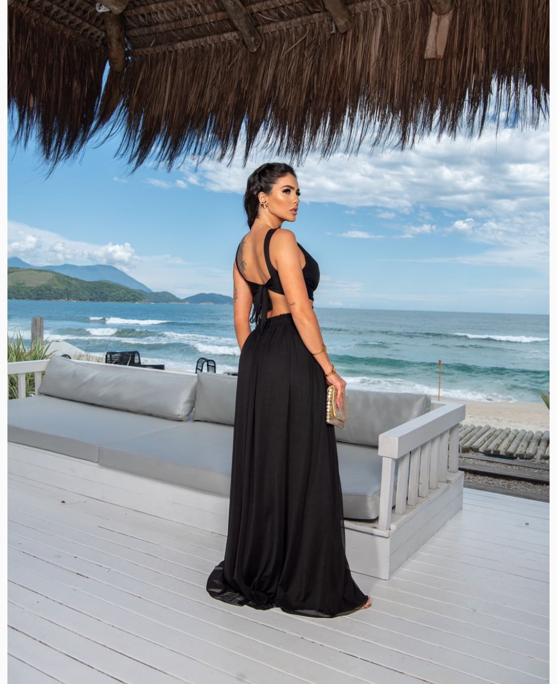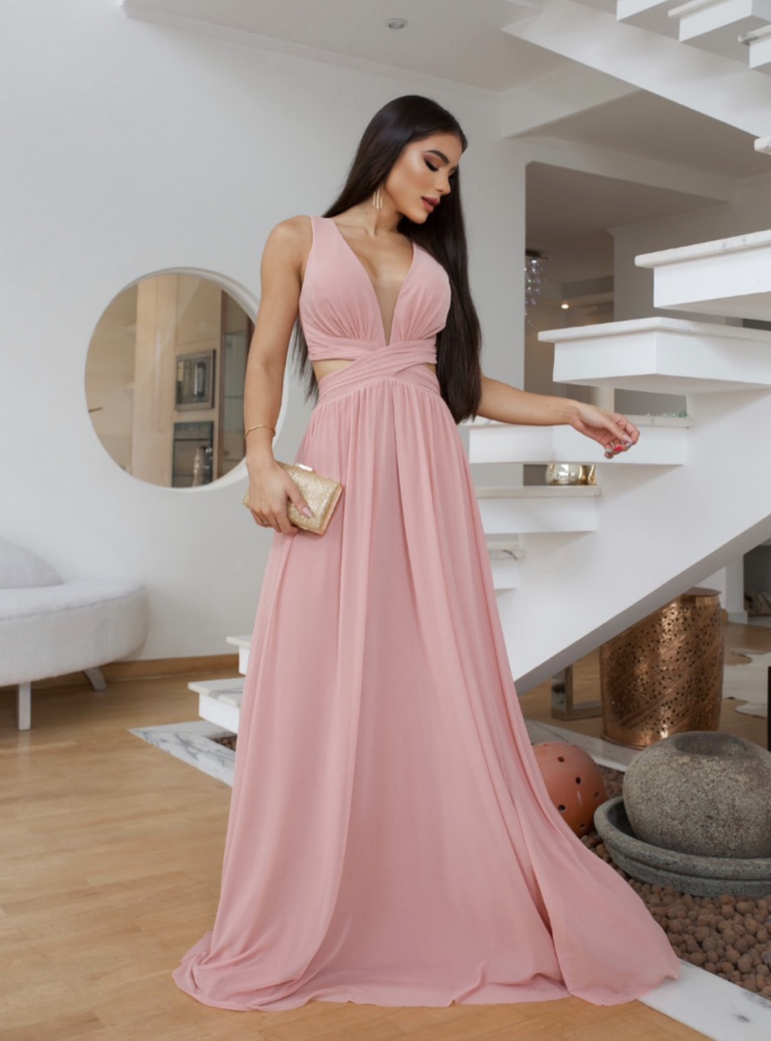 O vestido Sabrina com sua elegância e sofisticação se destaca por seus detalhes; decote em V com transparência em tule, aberturas laterais, amarração nas costas e além do tecido em micro tule que proporciona um caimento perfeito no corpo feminino.